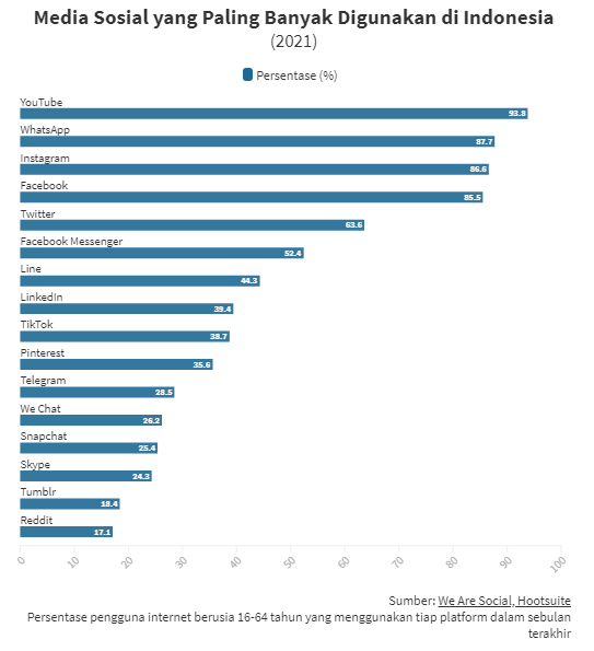 Indonesia adalah salah satu pengguna media sosial (medsos) terbesar di dunia. We are Social dan Hootsuite mencatat pengguna medsos di tanah air mencapai 170 juta atau 61,8% dari total penduduk per Januari 2021. Sebanyak 94,5% di antaranya merupakan pengguna medsos aktif, rata-rata 3 jam 14 menit dihabiskan untuk bermain medsos per hari.