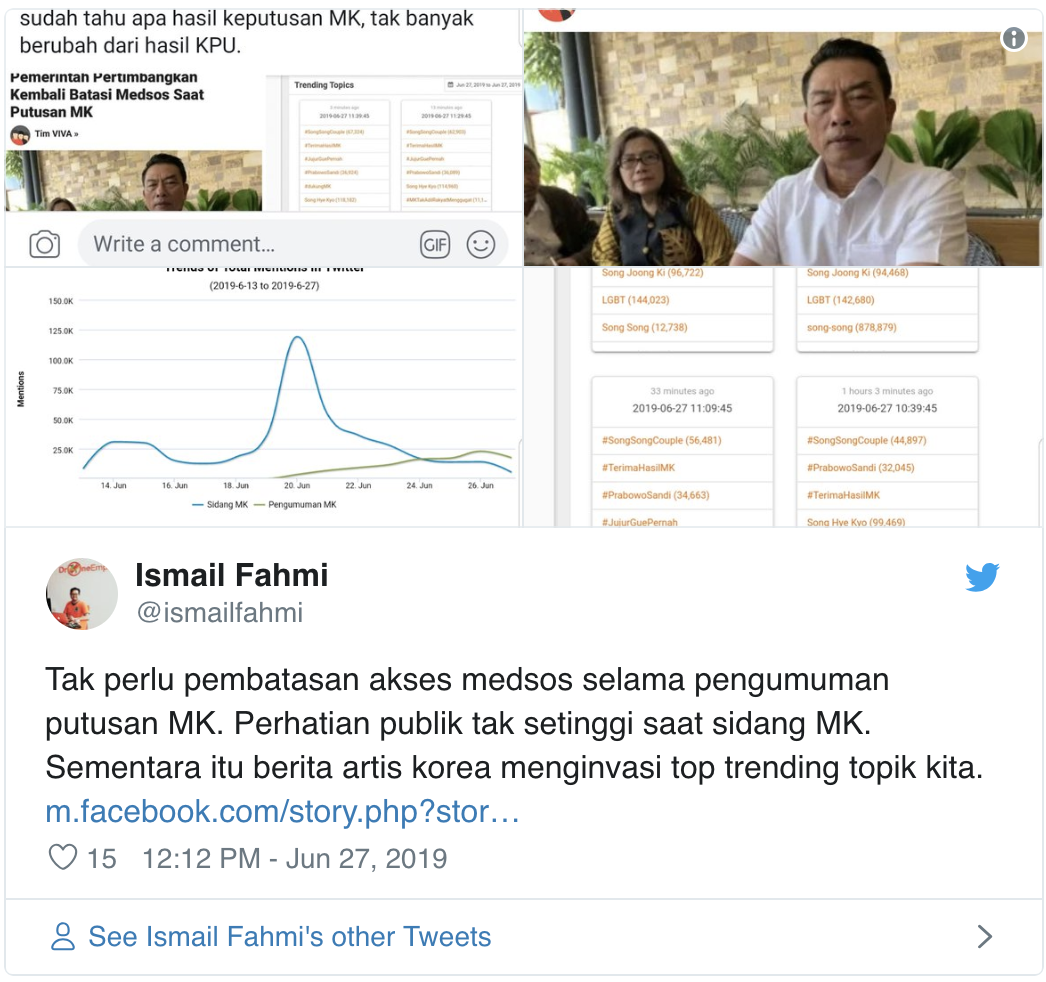 Link: https://www.cnnindonesia.com/teknologi/20190627184003-192-407124/sidang-putusan-mk-kurang-menarik-perhatian-di-media-sosial