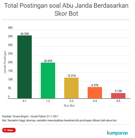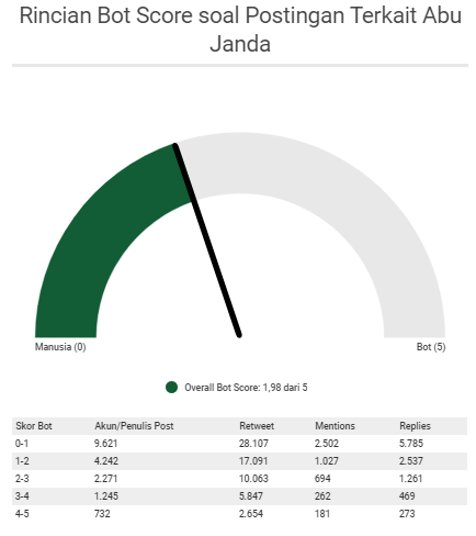 Setelah dihitung, rincian skor bot untuk percakapan di Twitter soal Abu Janda berada di angka 1,98. Hal ini menunjukkan bahwa mayoritas percakapan di topik tersebut tidak didominasi oleh akun-akun bot.”Ya arahnya kan skor 1-2 percakapan itu masih natural. Artinya mayoritas percakapannya natural,” kata dia.Dalam analisis ini, Fahmi menggunakan machine learning sebagai alat bantu menentukan mana akun bot dalam sebuah percakapan.