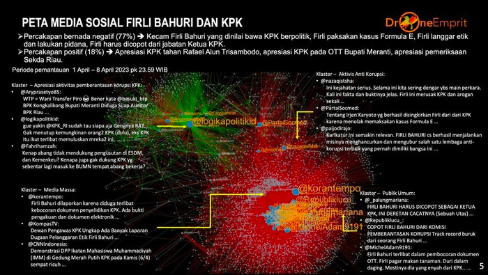 Peta SNA soal Firli dan KPK (Dok. Drone Emprit) Dari analisis ini, Ismail Fahmi menyimpulkan bahwa perbincangan soal Firli dan KPK didominasi oleh warganet kontra 77%. Sedangkan yang positif hanya 18%.